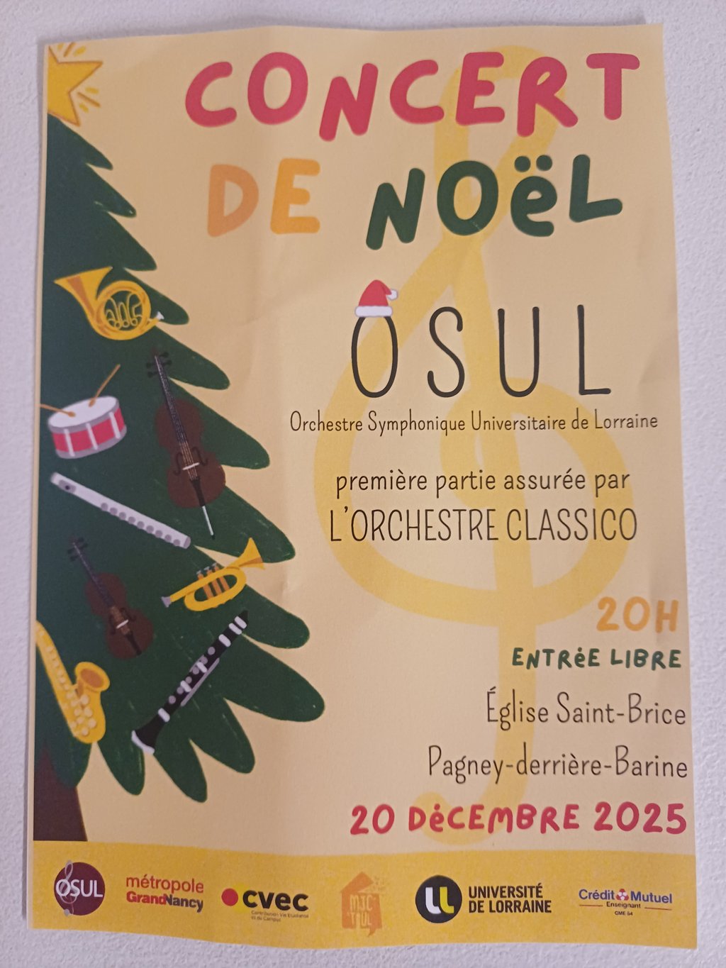 Concert de Noël de l'OSUL (Orchestre Symphonique Universitaire de Lorraine) avec en première partie l'Orchestre Classico de la LMJC, le samedi 20 décembre 2025 à 20 H à l'église Saint Brice de Pagney-Derrière-Barine.
