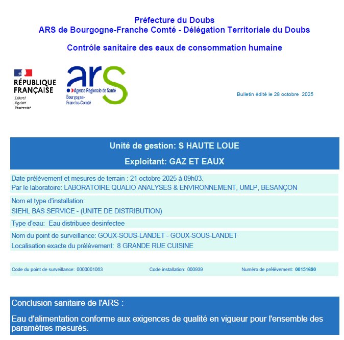 Résultat d'une analyse d'eau réalisée sur la commune de Goux-sous-Landet en pièce jointe