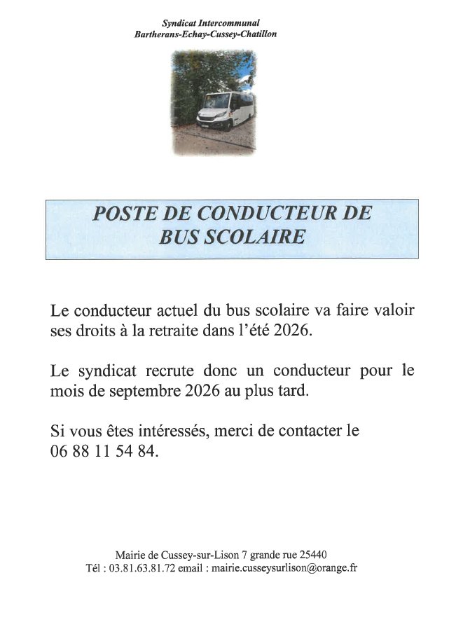 Le Syndicat intercommunal a lancé le recrutement d'un chauffeur de bus de l'école de Myon pour septembre 2026 au plus tard ..
