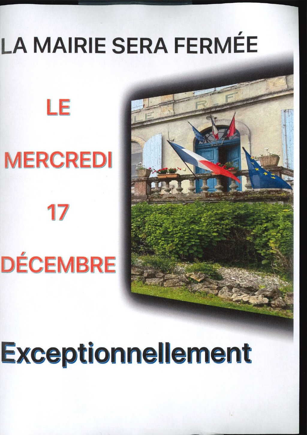 La mairie sera fermée exceptionnellement le mercredi 17 Décembre.