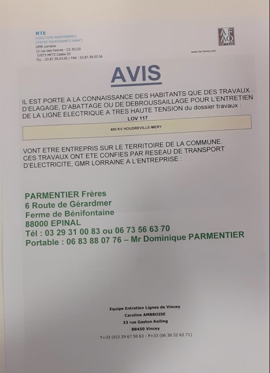 Conformément aux dispositions de l'article 12 de la Loi du 15 juin 1906 sur les distributions d'énergie et de l'arrêté du 17 mai 2001 relatif aux conditions techniques auxquelles doivent satisfaire les lignes de transport et de distribution électrique, des travaux d'élagage et d'abattage sont en cours sur le territoire de votre commune, afin d'assurer le bon fonctionnement des lignes hautes tension, mais également la sécurité des personnes aux abords de ces ouvrages.