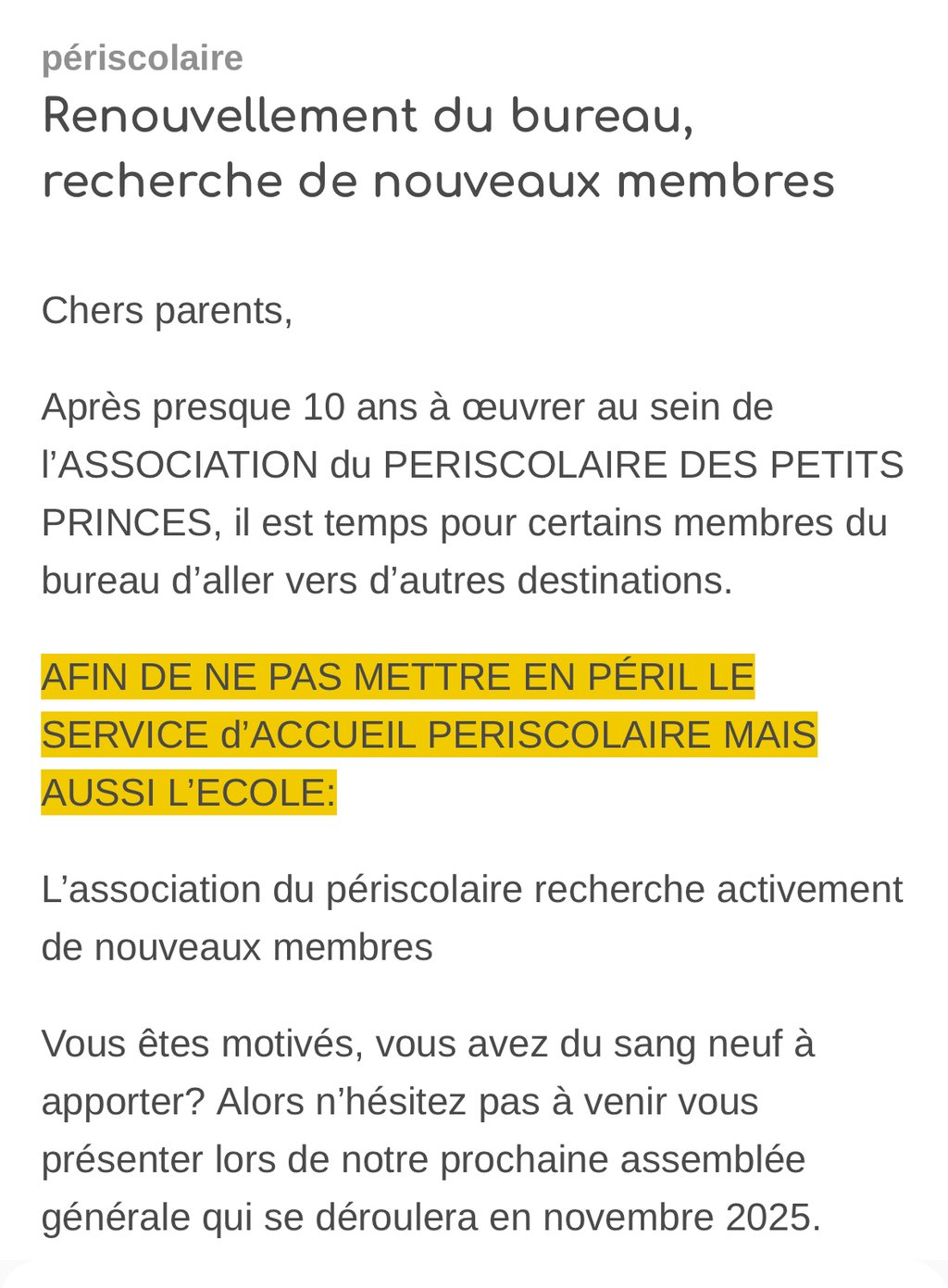 👑 Le périscolaire Les Petits Princes de l’école de Crépey vous informe que le bureau de l’association est à la recherche de personnes intéressées pour s’y impliquer !