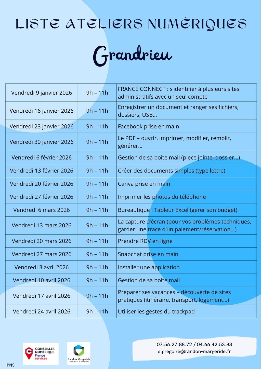 Ces ateliers auront lieu tous les vendredis de 9h à 11h à la mairie ainsi que des accompagnements individuels les vendredis après-midi. Inscription au 07.56.27.88.72 ou par mail : s.gregoire@randon-margeride.fr