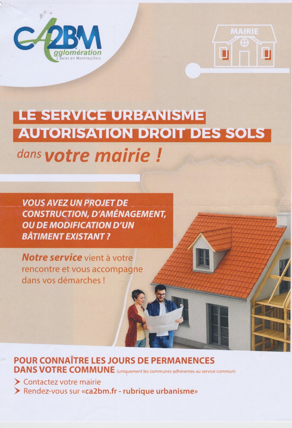 Le SERVICE URBANISME AUTORISATION DROIT DES SOLS de la CA2BM assurera à compter du 3 octobre 2025, une permanence à la mairie le matin de chaque premier et dernier vendredi du mois.