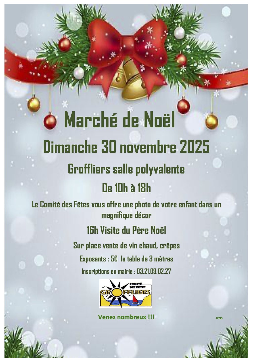 Le COMITE DES FETES organise un marché de Noël le dimanche 30 novembre 2025 de 10h à 18h à la salle polyvalente - Chemin Collier - GROFFLIERS;