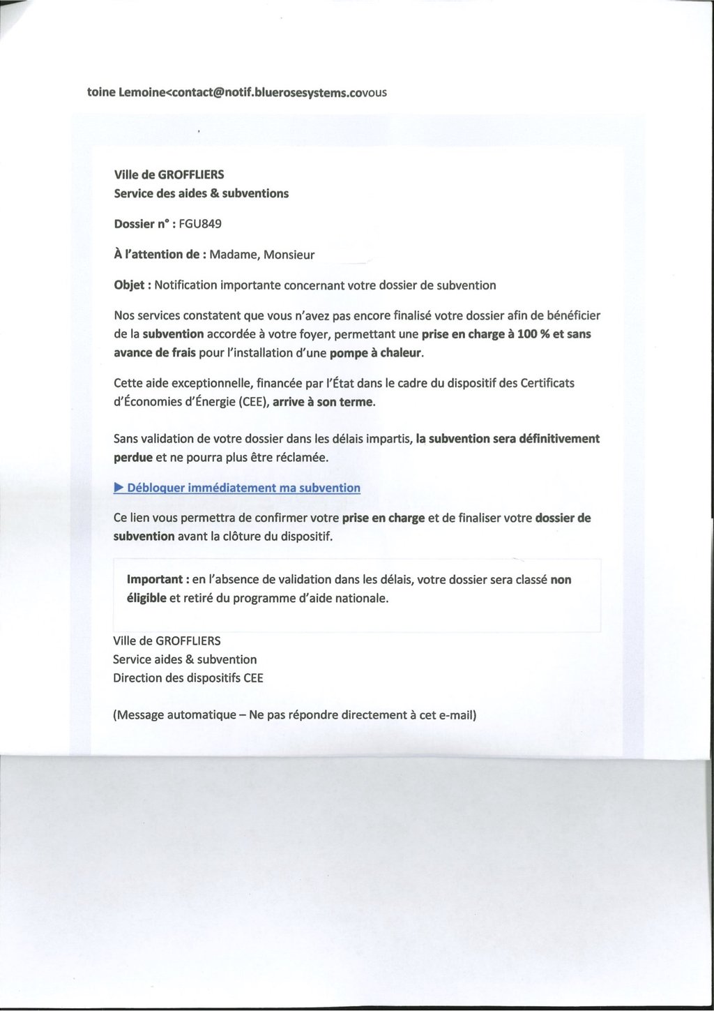 Un mail se prétendant de la mairie est actuellement envoyé à certains habitants de la commune.
