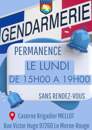 La Gendarmerie assure des permanences tous les lundis de 15h à 19h à la Caserne Brigadier Mellot – Rue Victor Hugo.