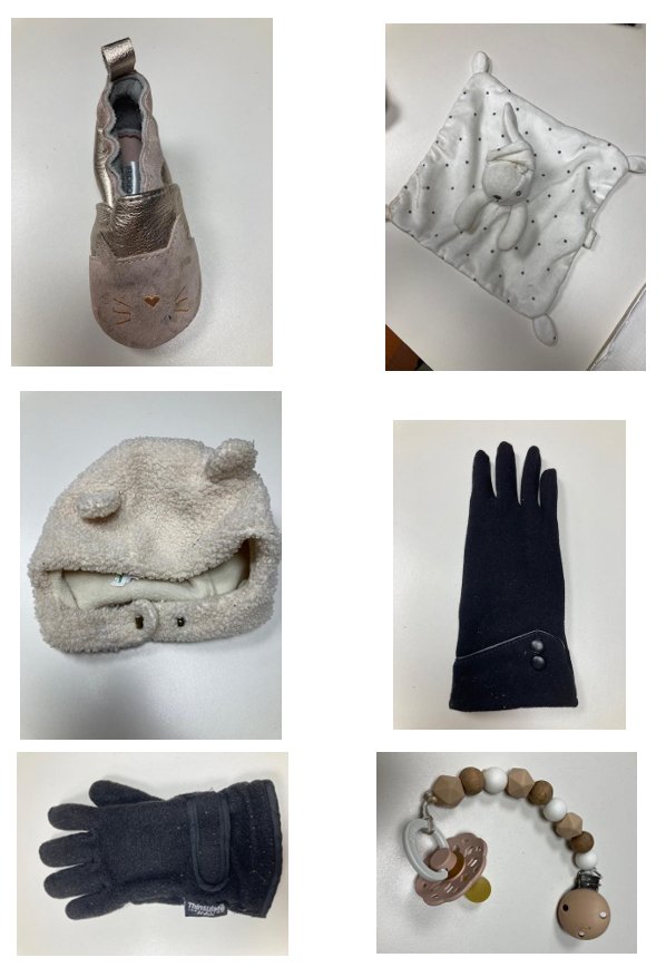Un chausson, un doudou, un bonnet, deux gants et une tétine avec accroche tétine ont été trouvés au marché de Noël.