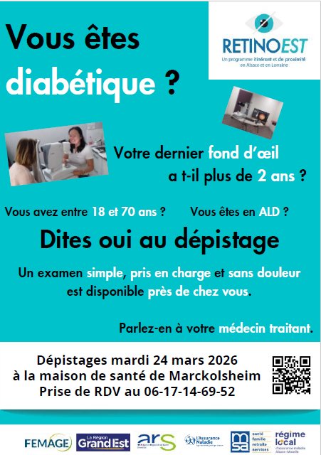 Le programme de dépistage de la rétinopathie diabétique propose un dépistage gratuit le 24 mars 2026 à la maison de santé de Marckolsheim.