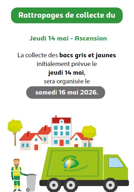 Le jeudi 14 mai 2026 étant férié, la collecte des bacs jaunes n’aura pas lieu ce jour-là, comme habituellement, et sera reportée au Samedi 16 mai 2026.