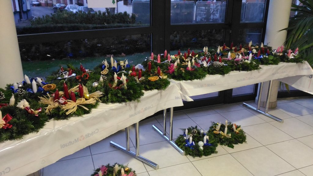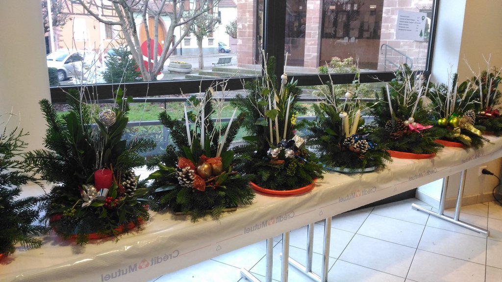 Marché de l'Avent de Guémar : exposition et vente de couronnes, d'arrangements et de décorations de Noël. Venez donner à votre intérieur cette âme de Noël si particulière à l'Alsace.