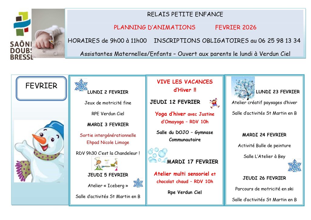 Ci-joint, le planning des animations de Février 2026 du Relais Petite Enfance.