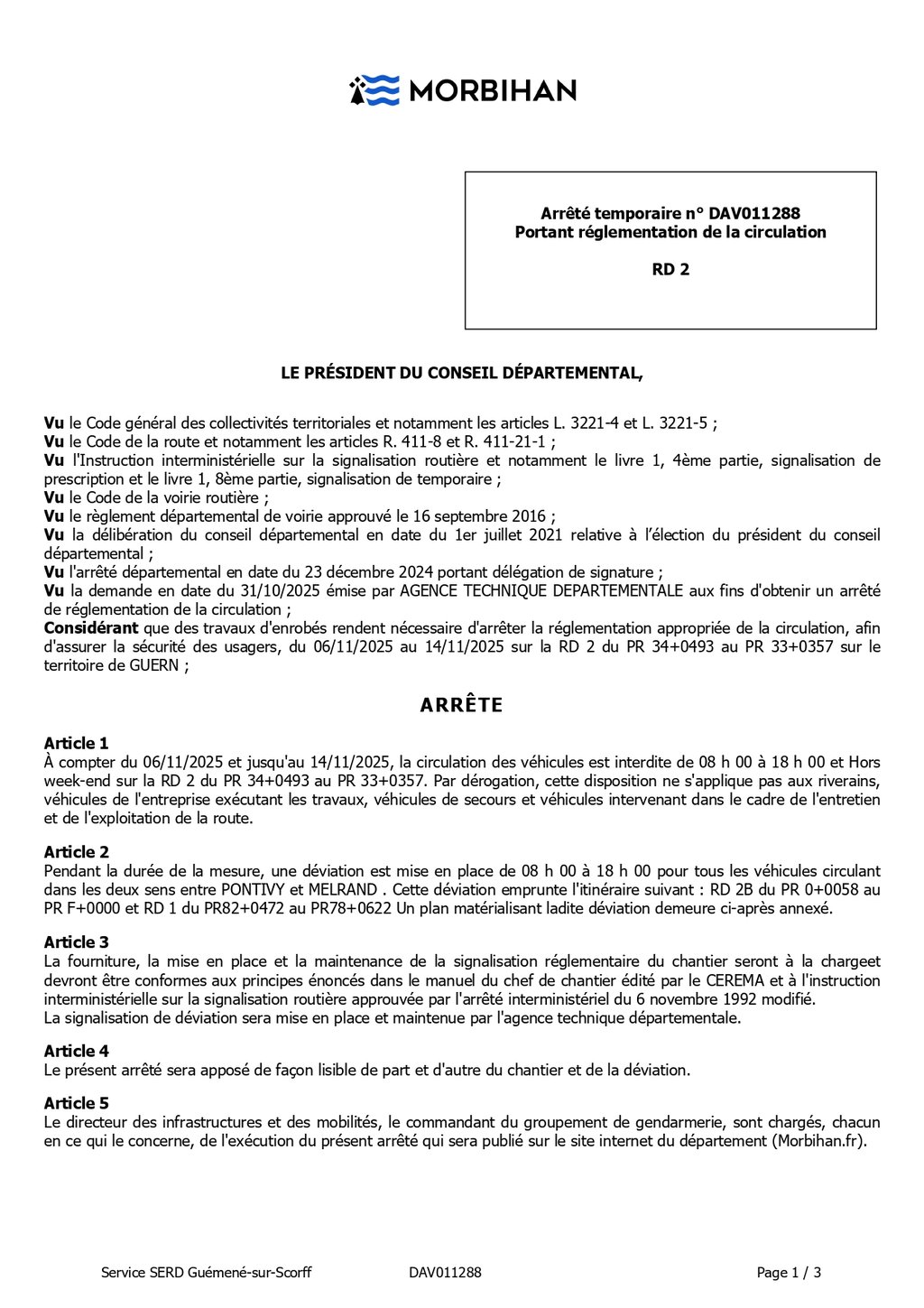 dans les deux sens entre PONTIVY et MELRAND . Cette déviation emprunte l'itinéraire suivant : RD 2B du PR 0+0058 au