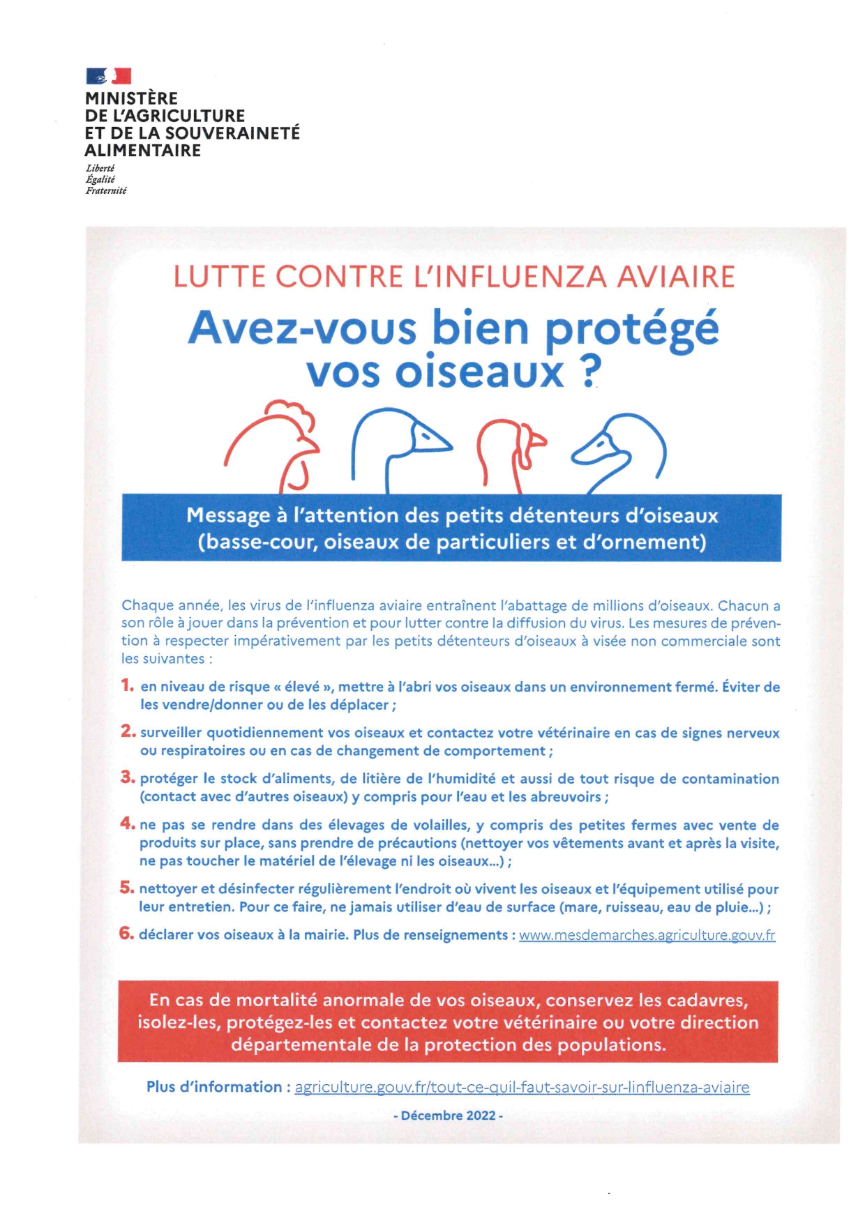 CIRCULAIRE PREFECTORALE - INFLUENZA AVIAIRE HAUTEMENT PATHOGENE (IAHP)