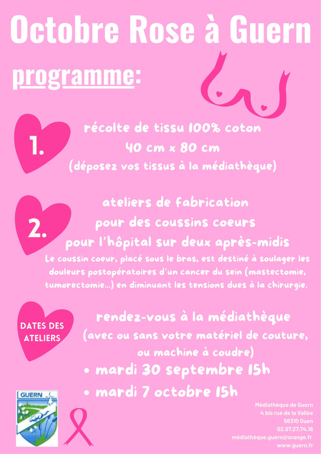 Le programme pour Octobre Rose à Guern: Fabrication de coussins en forme de coeur destinés à soulager les douleurs postopératoires d’un cancer du sein (ils diminuent les tensions dues à la chirurgie). Ces coussins seront donnés à l'hôpital de Pontivy.