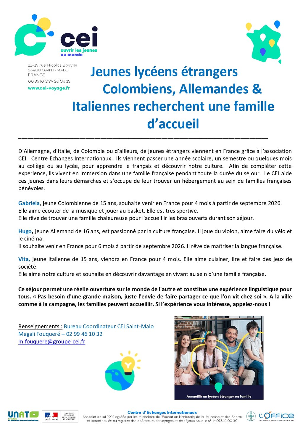 Le CEI recherche des familles d’accueil bénévoles pour des jeunes étrangers désireux de perfectionner leurs connaissances de la langue et de la culture française. Pendant toute la durée de leur séjour, ils seront hébergés en famille et scolarisés au lycée le plus proche de leur lieu d’hébergement.