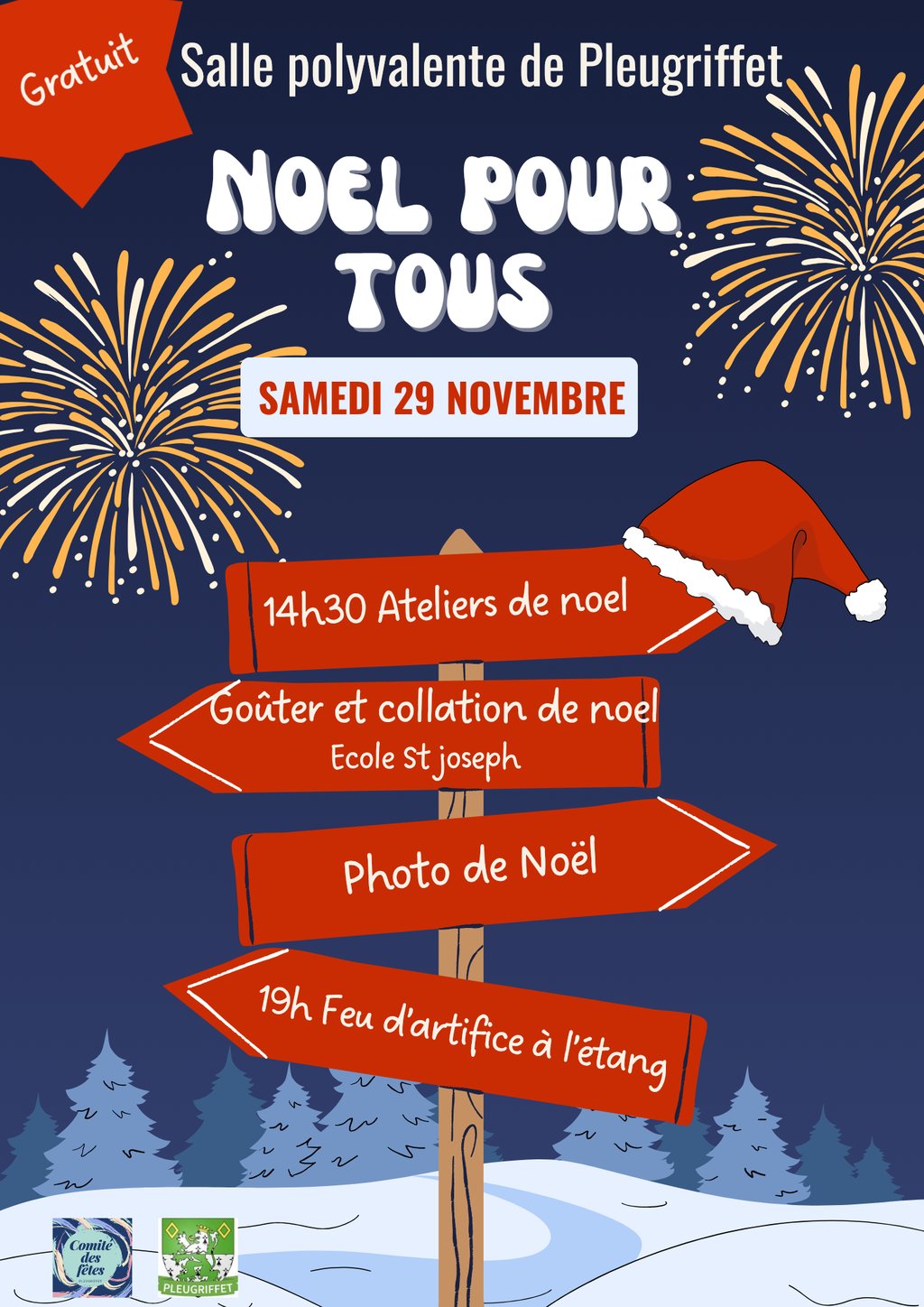 Animations:14 h 30 les ateliers de Noël gratuits : contes, bricolage, maquillage, sculpture de ballons, art flora.... pour tous à la salle polyvalente de Pleugriffet et à 19 h spectacle pyrotechnique son et lumière à l'étang de Pleugriffet. Samedi 29 novembre de 14 h 30 à 19 h, à la salle polyvalente, 29 rue Anne de Bretagne, Pleugriffet. Gratuit. Contact : 06 47 76 34 67, Biblio.pleugriffet@wanadoo.fr.