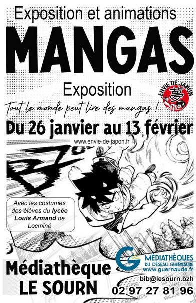 Venez découvrir notre exposition dédiée aux mangas : "Tout le monde peut lire des mangas !" Une occasion unique d’admirer les costumes créés par les élèves du lycée Louis Armand de Locminé et de vous immerger dans cet art captivant.