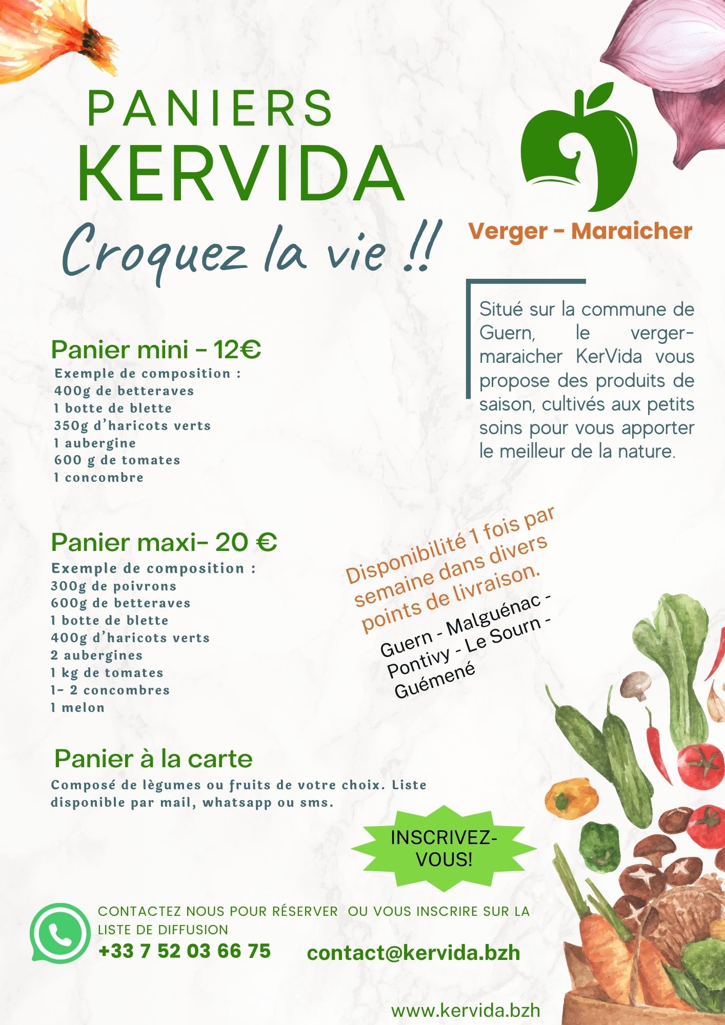 Le verger-maraîcher KerVida, installé à Guern, propose des paniers de légumes, en précommande ou sur place, tous les vendredi de 16 à 19h, au niveau de la halle en centre-bourg.