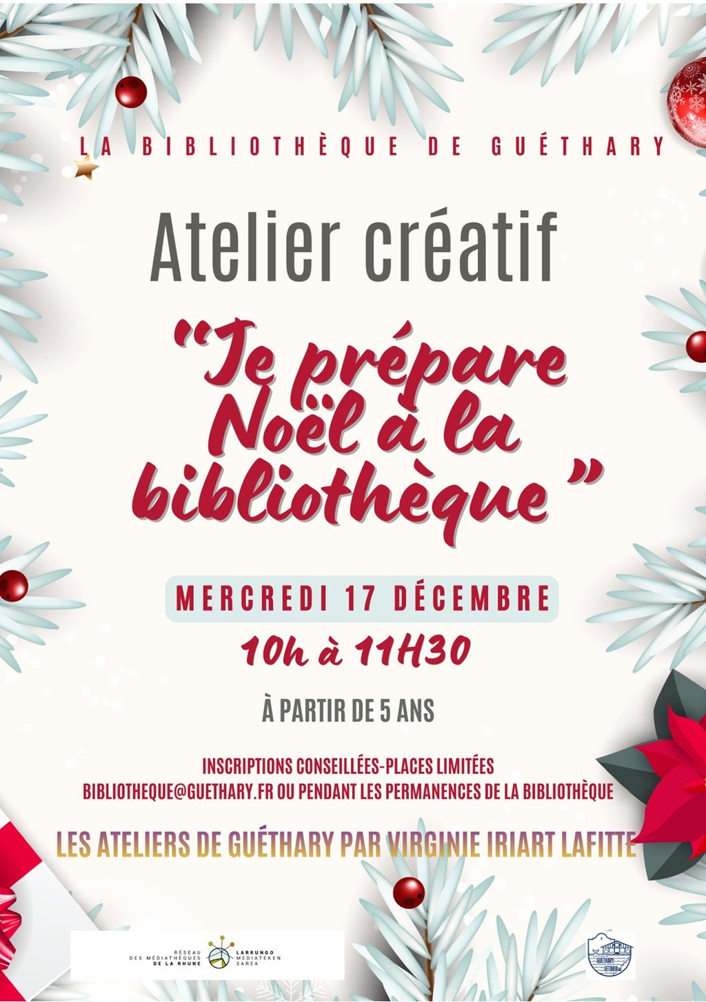 Atelier créatif "Je prépare Noël à la bibliothèque" le mercredi 17 décembre 2025 de 10h à 11h30 avec les ateliers de Guéthary par Virginie IRIART LAFITTE