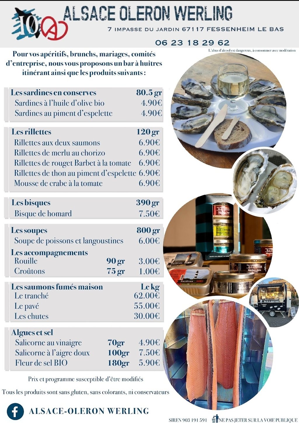 Je vous propose des huîtres Marennes Oléron fine de claires, d'octobre à fin avril, des conserves de poissons de la salicorne et mon saumon fumé maison.