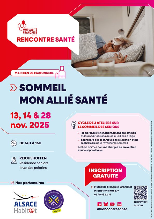 đĄ Pour mieux comprendre et amĂ©liorer ce prĂ©cieux alliĂ©, la MutualitĂ© Française Grand Est, la Commission des financeurs de la prĂ©vention de la perte dâautonomie dâAlsace et Alsace Habitat proposent un cycle de 3 ateliers Ă Reichshoffen, Ă partir du 13 novembre 2025.