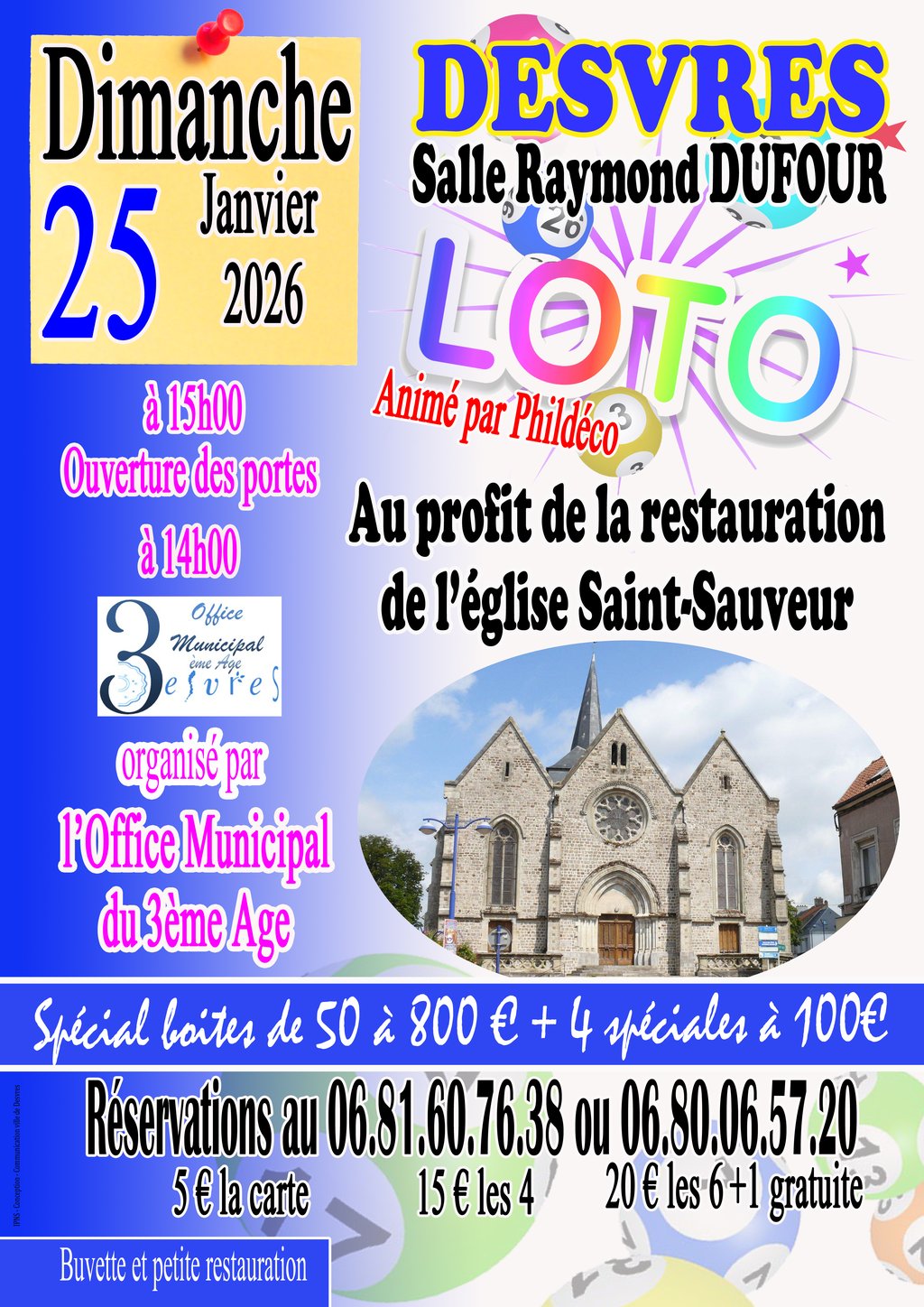 L'Office Municipal du 3ème âge vous donne rendez vous ce dimanche 25 janvier à la salle des fêtes R.Dufour pour son loto quine ouvert à tous organisé au profit de la restauration de l'église Saint-Sauveur.