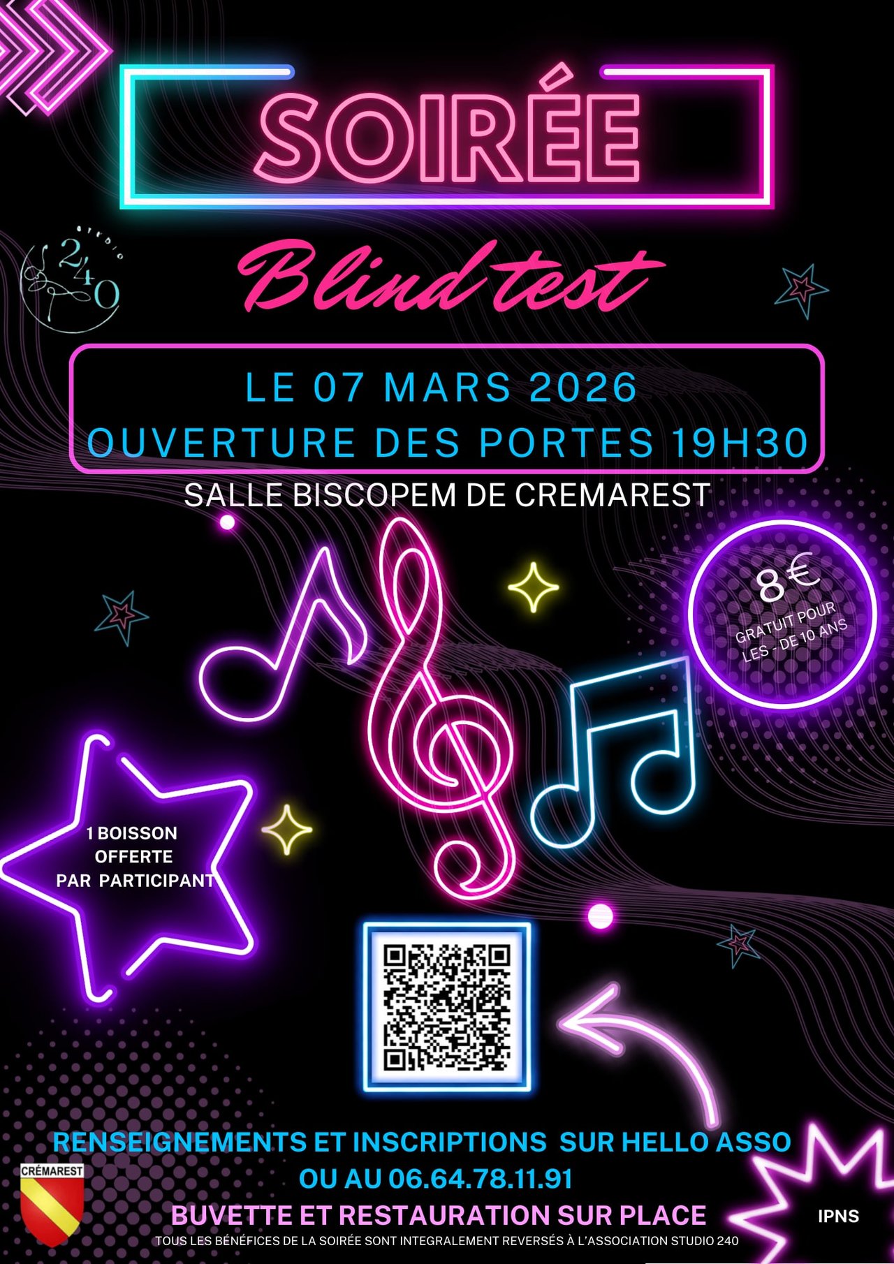 L'Association Studio 240 organise une soirée Blind Test le Samedi 07 Mars à la salle Biscopem