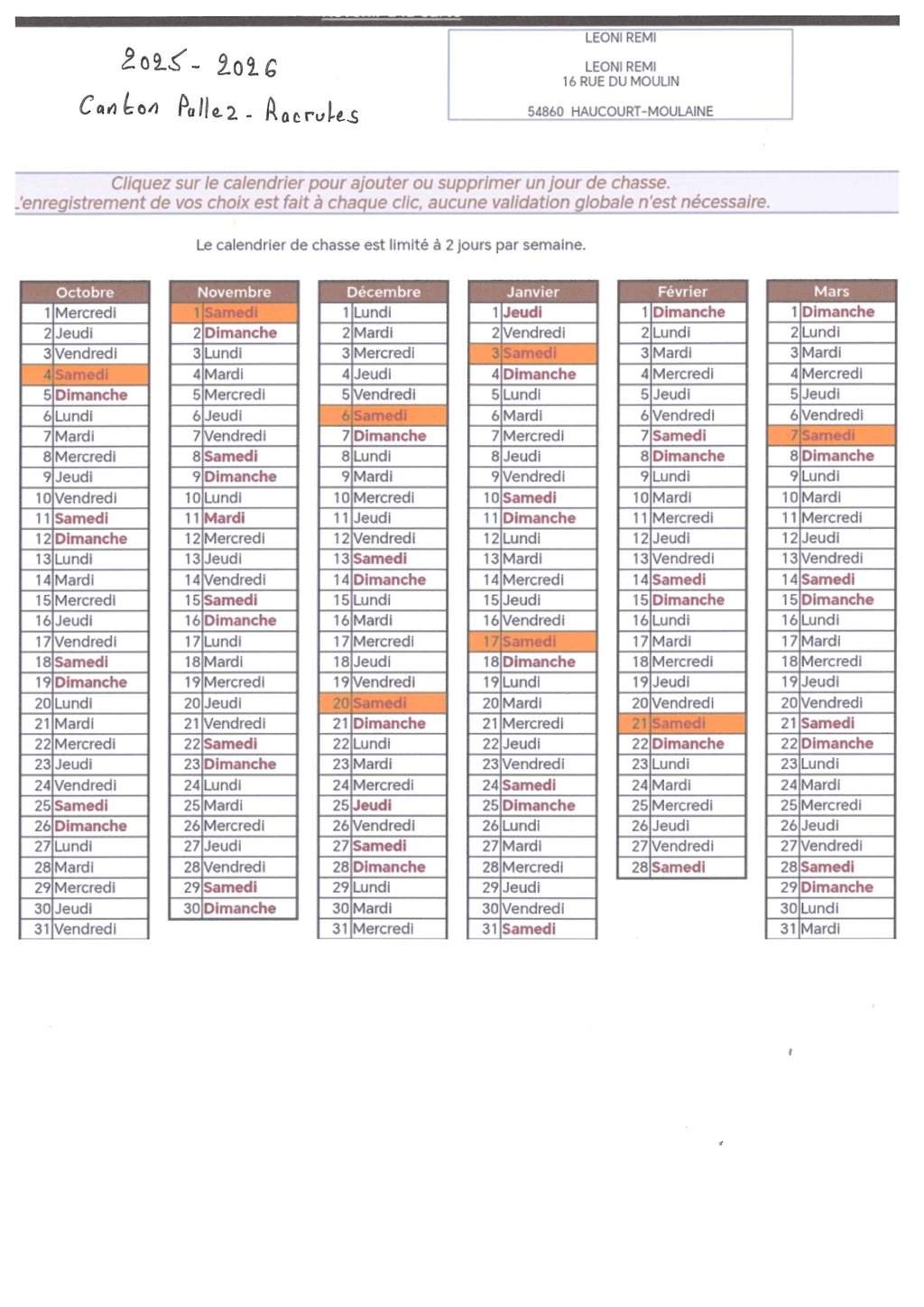 CALENDRIERS - CHASSE SAISON 2025 / 2026 - COMMUNE HAUCOURT-MOULAINE