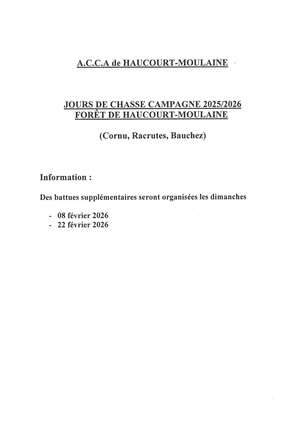 Jours de chasse 2025 / 2026 - Bois Cornu / Bauchez / Racrutes