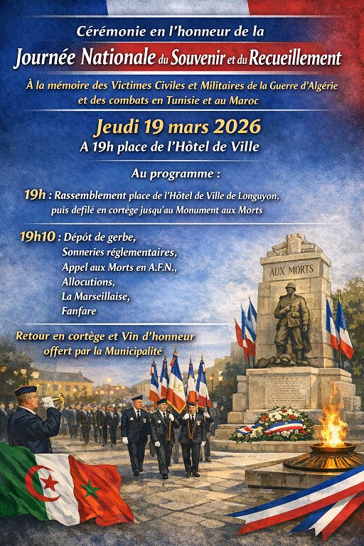 19h : rassemblement place de l'Hôtel de Ville de Longuyon, puis défilé en cortège jusqu'au Monument aux Morts
