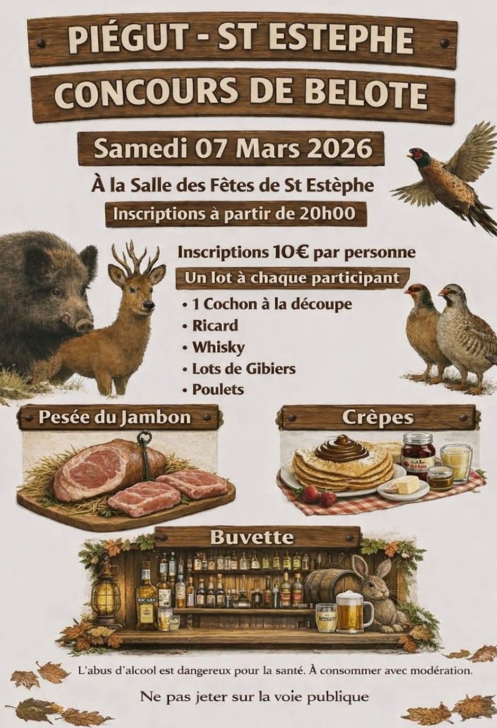 Un concours de belote est organisé par la société communale de chasse de Saint-Estèphe le samedi 7 mars à la salle des fêtes.