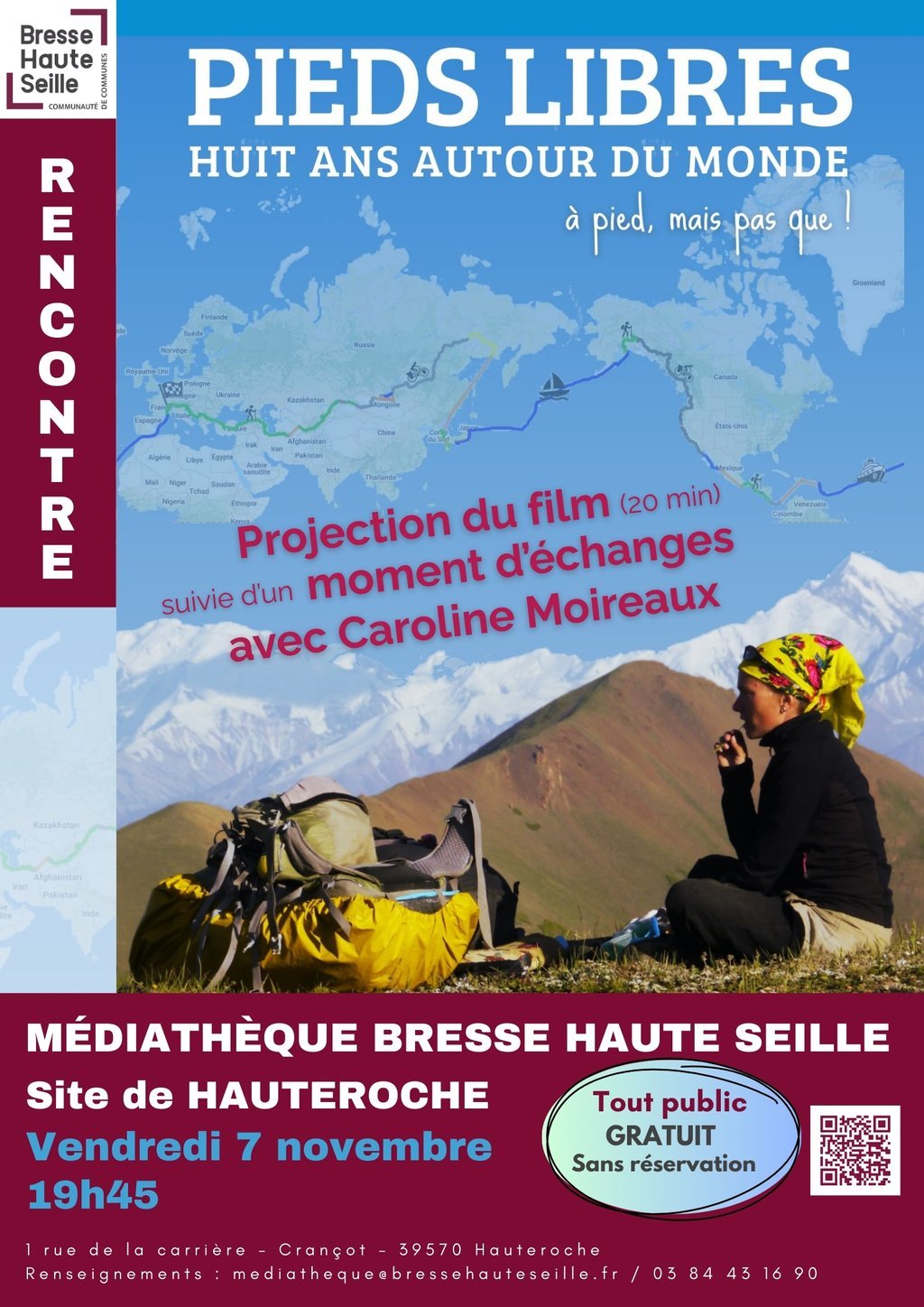 La médiathèque aura le plaisir d'accueillir la Jurassienne Caroline Moireaux qui, en 2011, s'est lancée dans un tour du monde qui a duré 8 ans ! Elle a parcouru plus de 53 000 km à travers trente pays, principalement à pied mais aussi à vélo et en bateau.