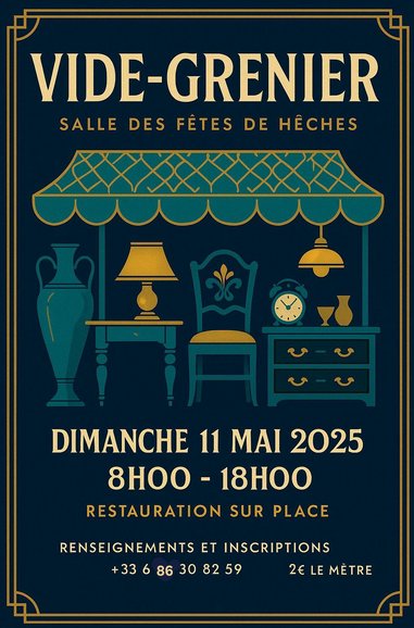 Le comité des fêtes de Hèches sera heureux de vous accueillir à la salle des fêtes du village pour le vide grenier qu'il organise.