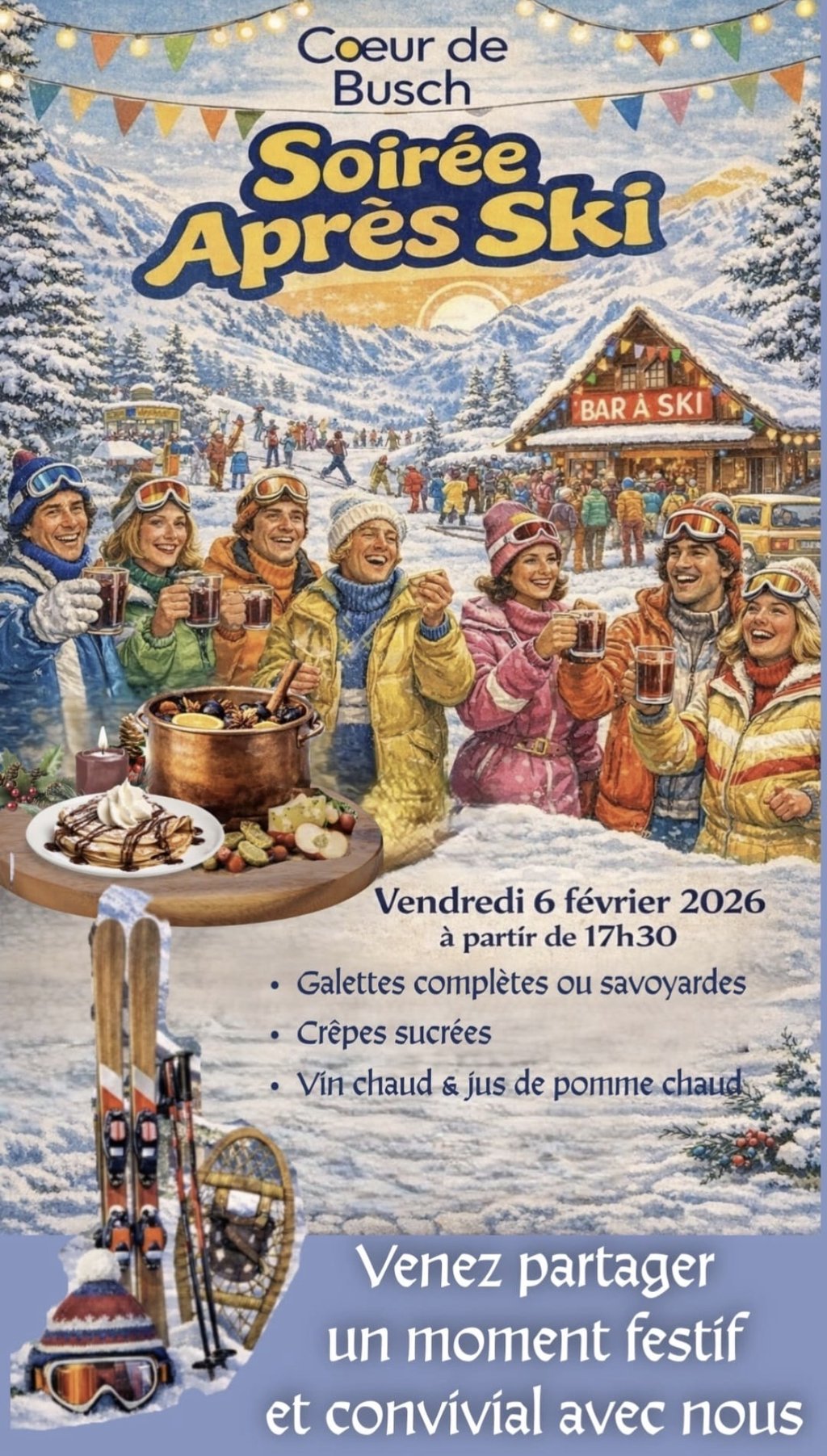 L'association Coeur de Busch vous convie à une soirée après-Ski lors de son marché des producteurs locaux le vendredi 06 février 2026 à l’ancien dépôt des pompiers de Buschwiller à partir de 17h30.