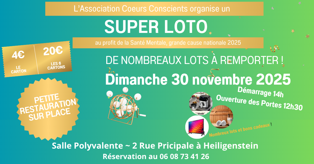 A cette occasion, l'association cœurs conscients organise un Loto Bingo. Les bénéfices servirons à financer des ateliers de méditation et de relaxologie ainsi que des séances avec des praticiens du mieux-être pour des personnes en souffrance mentale, burn-out, bore-out, troubles dépressifs récurrents.