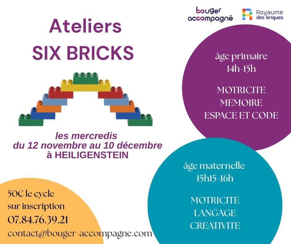 Ancienne enseignante formée aux activités SIX BRICKS, Joelle WALSCH propose un cycle de 5 ateliers qui, au travers de jeux et de défis avec des briques colorées, vont nourrir et développer la motricité, le langage et la créativité pour les enfants d'âge maternelle et également la mémoire et le travail dans l'espace pour les enfants d'âge primaire.