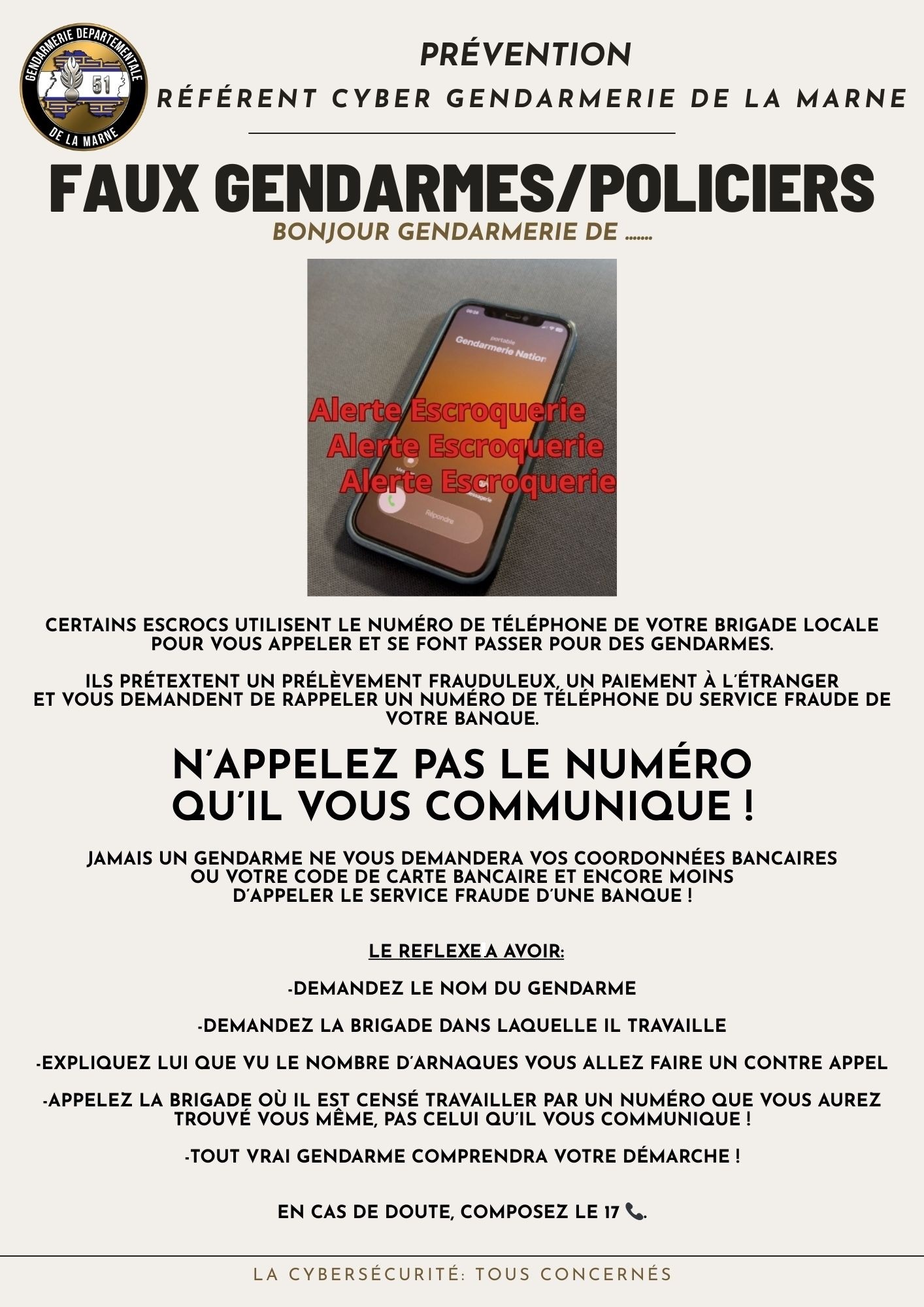 La cellule cyber du Groupement de Gendarmerie Départementale de la Marne, nous informe sur les agissements crapuleux de personnes se faisant passer pour des gendarmes ou des policiers.