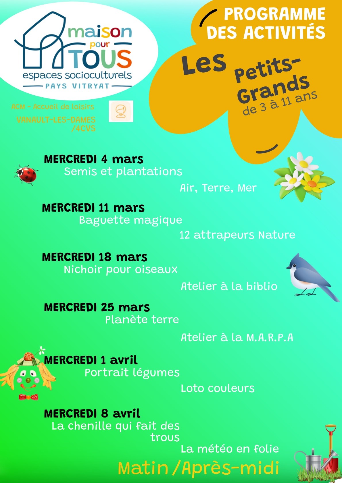 La Maison Pour Tous du Pays Vitryat a le plaisir de vous communiquer les programmes d’activités du mercredi 4 mars au mercredi 8 avril 2026, qui seront proposés à l’accueil de loisirs de Vanault-les-Dames.