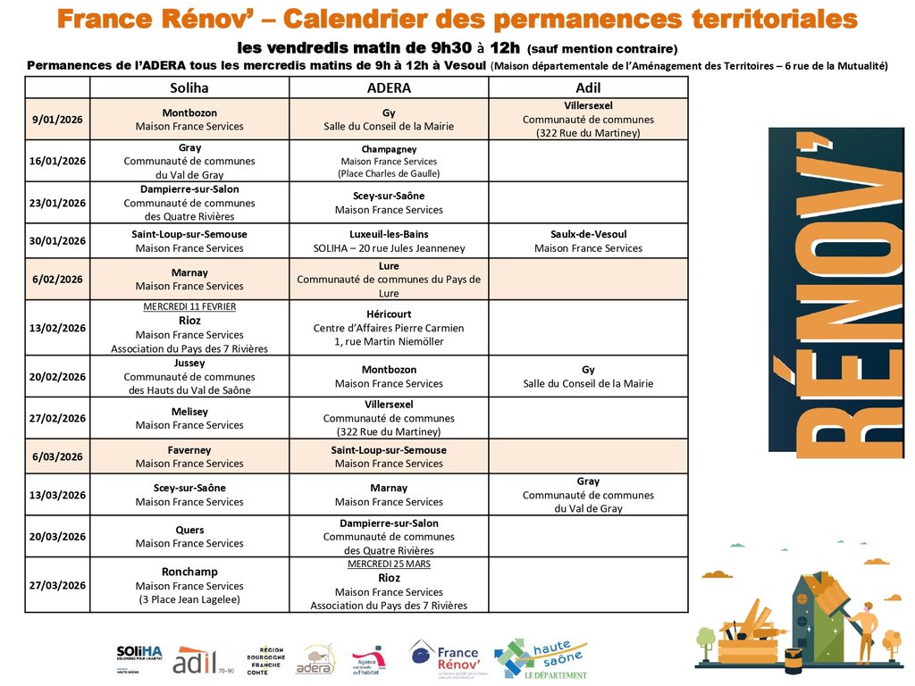 Afin de couvrir l'ensemble du territoire, ces permanences sont assurées à tour de rôle par l'ADERA, l’ADIL et Soliha et permettent de créer des points de contact accessibles dans les zones rurales et urbaines éloignées de Vesoul.