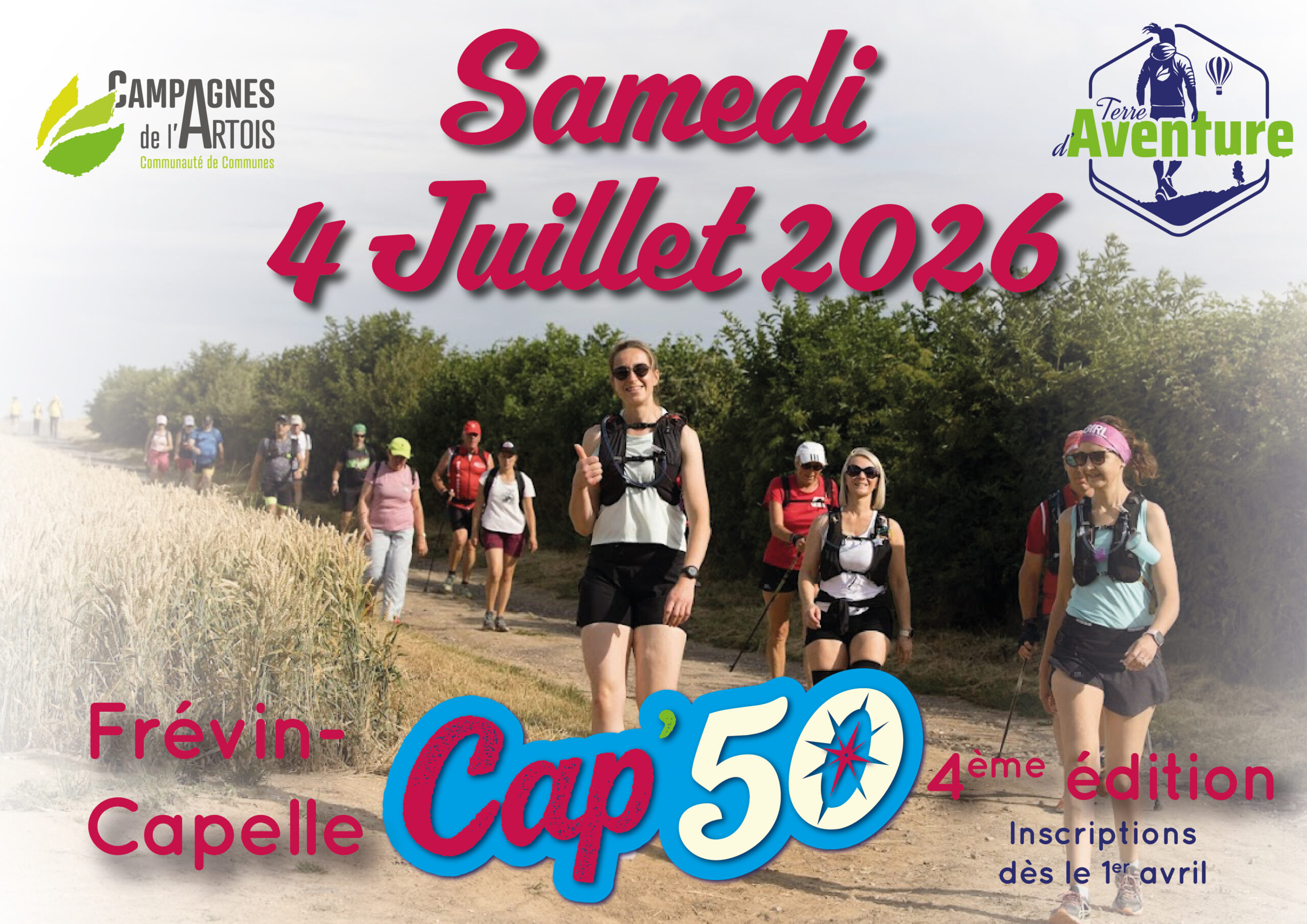 Fort du succès rencontré lors des précédentes éditions, le CAP’50 fera son grand retour pour une 4ᵉ édition le samedi 4 juillet 2026, avec un nouveau point de départ à Frévin-Capelle.Organisé par le service Sport des Campagnes de l’Artois, le CAP’50 est devenu un événement sportif et convivial incontournable, rassemblant chaque année plusieurs centaines de participants venus relever un défi à leur mesure, au cœur des paysages de l’Artois.Un défi accessible à tousLe principe reste identique et fait le succès du CAP’50 :5 parcours balisés, de différentes distancesPlusieurs pratiques possibles : randonnée, marche nordique, course à pied, balade avec chienUne distance cumulée de 50 km, à réaliser librement : un, deux, plusieurs parcours… ou l’intégralité pour les plus audacieux !Chacun participe à son rythme, selon ses capacités et ses envies.Un projet collectif ancré sur le territoireCette 4ᵉ édition sera organisée en partenariat avec la commune de Frévin-Capelle et son comité des fêtes, dans un esprit de partage, de convivialité et de valorisation du territoire.Après Estrée-Wamin en 2025, le CAP’50 poursuit son objectif : mettre en lumière les communes, les chemins et le patrimoine des Campagnes de l’Artois.Un événement qui rayonneLe CAP’50 attire désormais bien au-delà du territoire : participants de la région lilloise, de la Côte d’Opale et même de l’étranger, confirmant les Campagnes de l’Artois comme une véritable terre d’aventure et de randonnée.À noter dès maintenantSamedi 4 juillet 2026Départ : Frévin-CapelleLes informations pratiques (inscriptions, parcours, règlement) seront communiquées prochainement.Rendez-vous en juillet 2026 pour un nouveau défi sportif, humain et convivial !