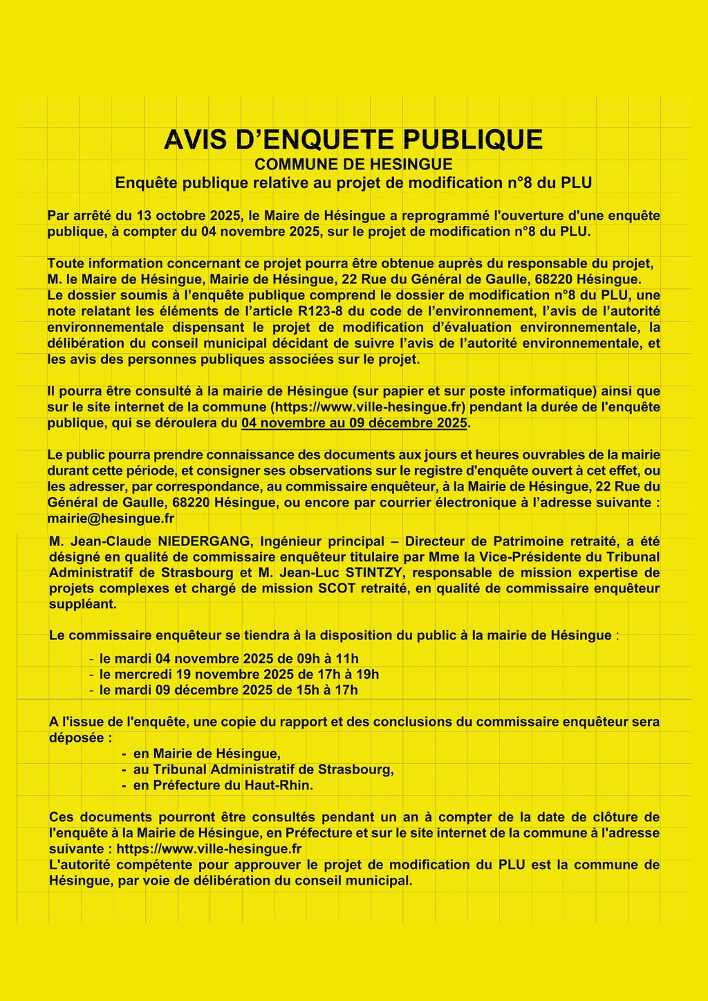Une enquête publique est ouverte concernant la modification n°8 du Plan Local d’Urbanisme (PLU) de la commune de Hésingue. Les habitants sont invités à consulter le dossier et à formuler leurs observations pendant la durée de l’enquête du 4 novembre au 9 décembre 2025.