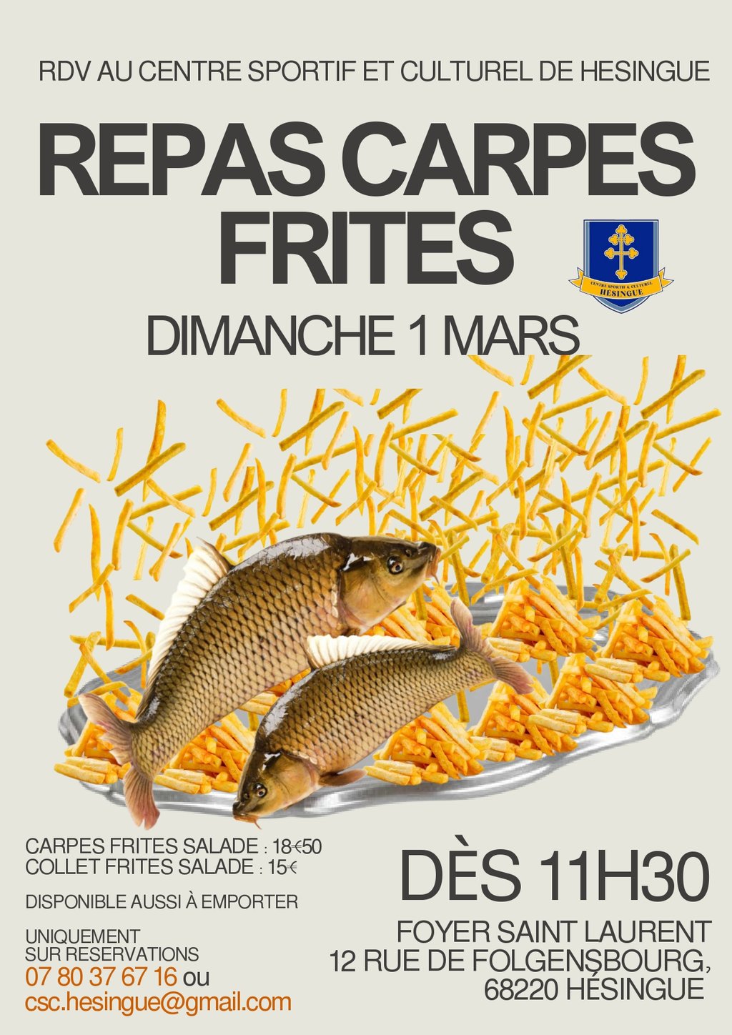 REPAS CARPES FRITES au foyer Saint Laurent de Hésingue le dimanche 1er mars 2026 à partir de 11 H 30