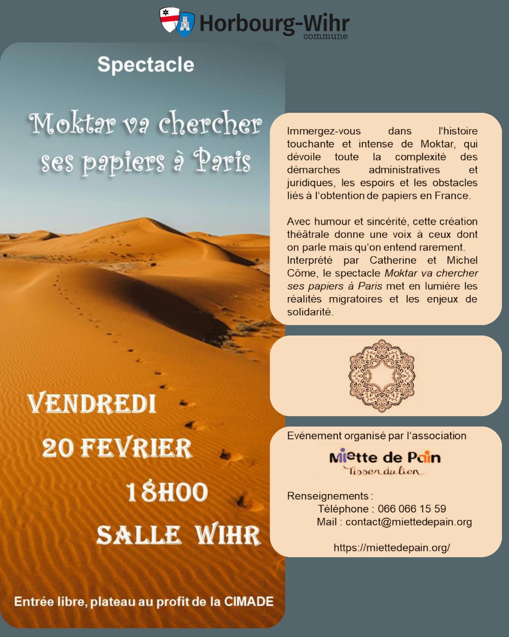 Renseignements : 066 066 15 59 ou contact@miettedepain.org