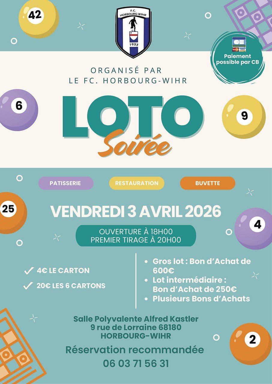 🎉 LOTO SOIRÉE – VENDREDI 3 AVRIL 2026 🎉 Par le F.C. Horbourg-WihrÂ