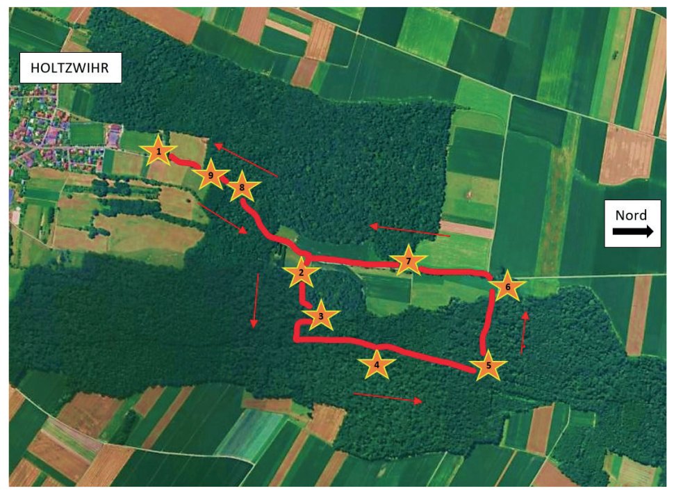 đ Une partie est également accessible aux personnes à mobilité réduite (étapes 1, 2, 7, 8, 9). Le départ du sentier se fait à partir du plateau sportif de Holtzwihr (sentier balisé avec le logo).