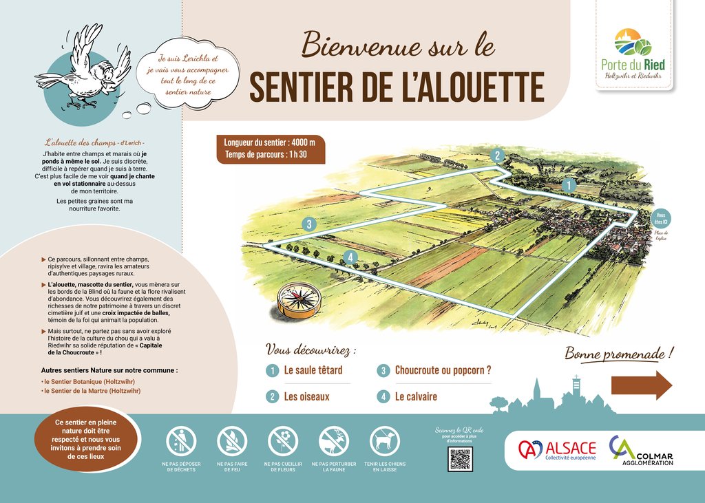 - L’alouette, notre mascotte du sentier nommée Lerichla, vous mènera sur les bords de la Blind où la faune et la flore rivalisent d’abondance. Vous découvrirez également des richesses de notre patrimoine à travers un discret cimetière juif et une croix impactée de balles, témoin de la foi qui animait la population.