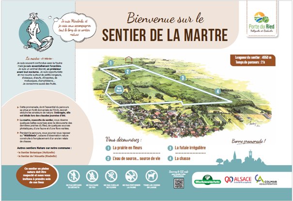 • La Martre, mascotte du sentier, vous réserve quelques belles surprises avec la découverte des dernières prairies du Ried, de quelques sources phréatiques, d’une faune et d’une flore variées.