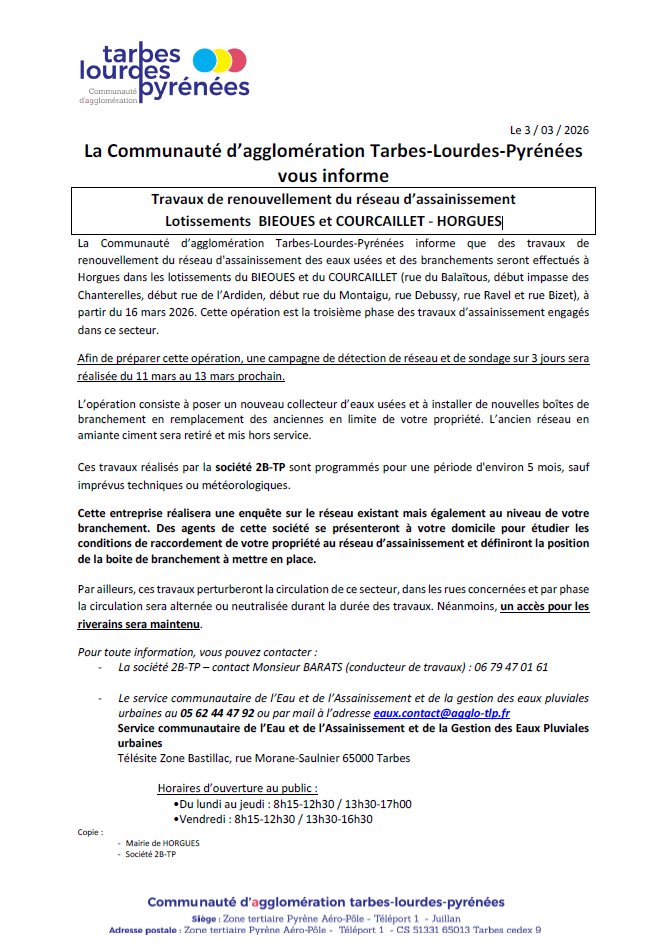 La Communauté d’agglomération Tarbes-Lourdes-Pyrénées informe que des travaux de renouvellement du réseau d'assainissement des eaux usées et des branchements seront effectués à Horgues dans les lotissements du BIEOUES et du COURCAILLET (rue du Balaïtous, début impasse des Chanterelles, début rue de l’Ardiden, début rue du Montaigu, rue Debussy, rue Ravel et rue Bizet), à partir du 16 mars 2026. Cette opération est la troisième phase des travaux d’assainissement engagés dans ce secteur.
