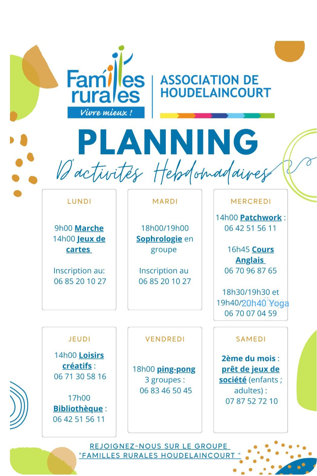 Familles Rurales Houdelaincourt propose des activités hebdomadaires :
